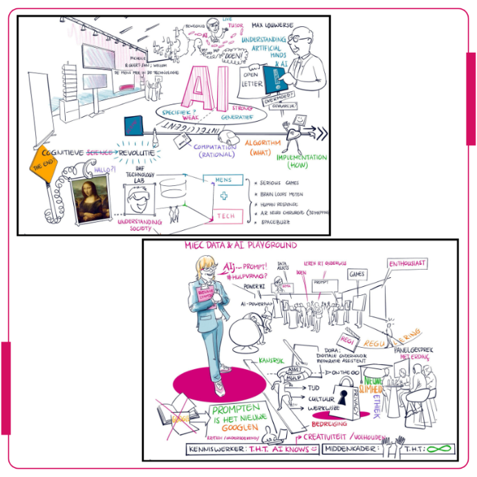 Visueel vertaler Steven Bouwens vatte de dag live samen in twee krachtige visuele platen vol gesprekken, inzichten en ontmoetingen. Daarnaast maakte Elmer van Bree een sfeervolle video-impressie van de dag, met bijdragen van onder anderen Max Louwerse, Michelle van Woudenberg - Linders en Erdinç Saçan, die de urgentie en kansen van AI in het onderwijs helder neerzetten.